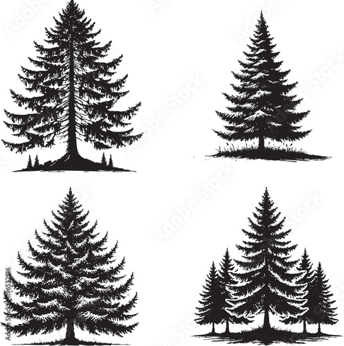 High-Quality Monochrome Vector Silhouettes of the Spruce Tree Isolated on a White Background"