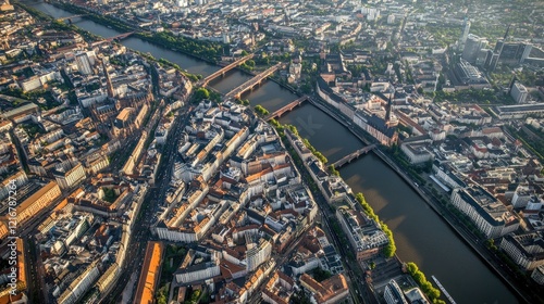 High-resolution aerial view of Frankfurt with bustling streets and the financial district