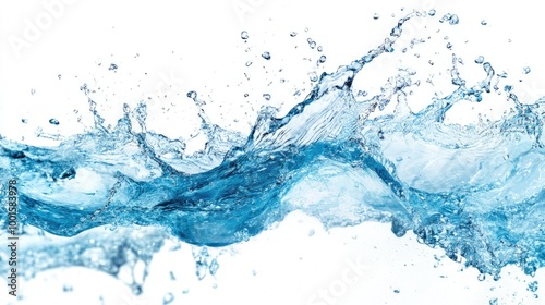 High-resolution blue water splash isolated on a white background, emphasizing the dynamic motion and detailed splashing effects