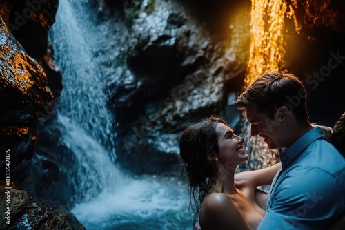 High-resolution brightly lit photorealistic candid photograph of a young couple enjoying a moment of happiness in front of a waterfall, their smiles lighting up the scene. The image is styled like a