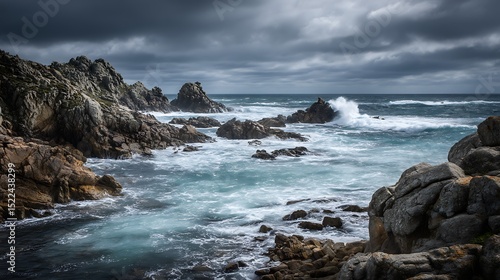 cinematic, seascape, crashing, wave, hitting, rugged, coastal, rock, overcast, sky, dramatic, ocean, spray, moody, intense, tone, natural, texture