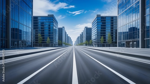 High-resolution photograph of an empty, straight asphalt road running between modern glass-and-steel high-rise buildings under a clear blue sky. A clean, symmetrical, and futuristic urban scene with v