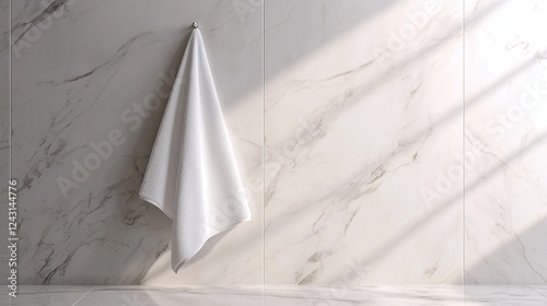 high-resolution photostock of a white towel hanging in a clean bathroom