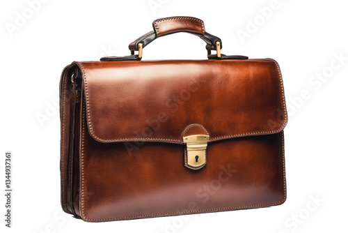 High-resolution product photography of a rich brown leather briefcase with classic design elements like polished brass hardware and flap closure against a isolated on transparent background