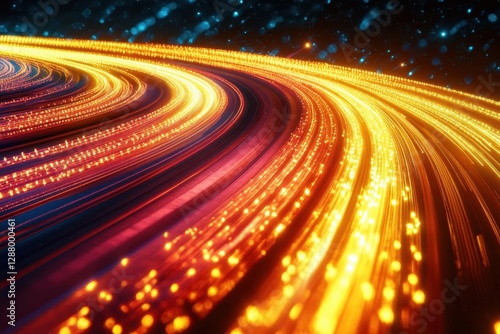 high-speed light trails through quantum tunnel, fractal energy streams in crimson and gold, abstract digital landscape with dynamic motion blur effects
