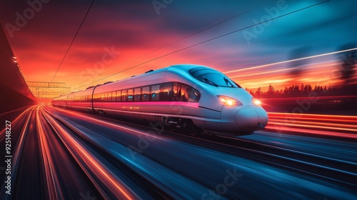 train, high speed, sunset, transportation, motion, speed, track, vibrant, dynamic, modern, travel, railway, technology, fast, energy, colourful, evening, commute, motion blur, futuristic, urban, movement, power, journey, transport, landscape, twilight, rail, city landscape, efficiency, sleek, infrastructure, mobility, high technology, innovation, velocity, night, station, road, traffic