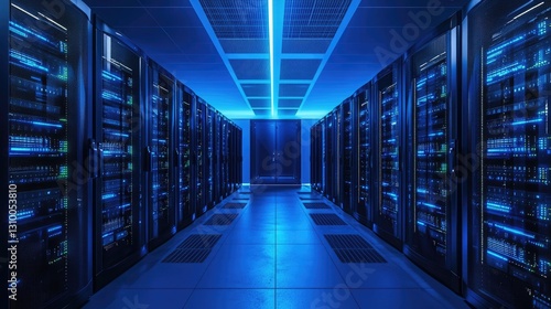 High-tech data center with glowing blue server racks and a futuristic atmosphere. Ideal for cloud computing, cybersecurity, network infrastructure, and digital technology concepts