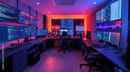 workstation, technology, screen, monitor, computer, desk, software, coding, audio, programming, interface, datum, sound, productivity, innovation, gaming, equipment, lighting, electronic, creative, design, workspace, modern, professional, setup, cable, utility, power, visualisation, network, information, analysis, performance, music, digital, control, environment, architecture, office, aesthetic, contemporary, research, automation, hardware, communication, connectivity, organisation, configuration