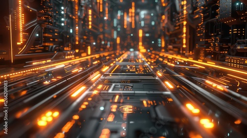 High-tech futuristic background with sleek glowing lines, soft light pulses and holographic effects.