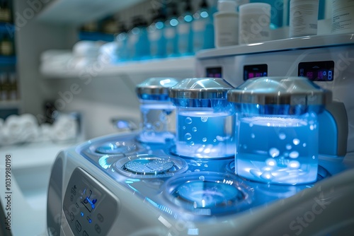 High-Tech Skincare Equipment with Illuminated Blue Solutions