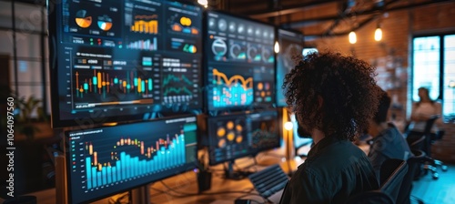 High-Tech Startup Office with Digital Screens Displaying Growth and Revenue Graphs for Strategic Discussion