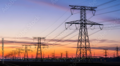 High-voltage electrical tower transmits power across vast distances. The powerful energy infrastructure symbolizes electricity supply, transmission networks, and industrial strength