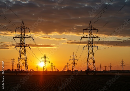 High-Voltage Power Lines at Sunset — Silhouette of Electric Transmission Towers Against Vibrant Sky