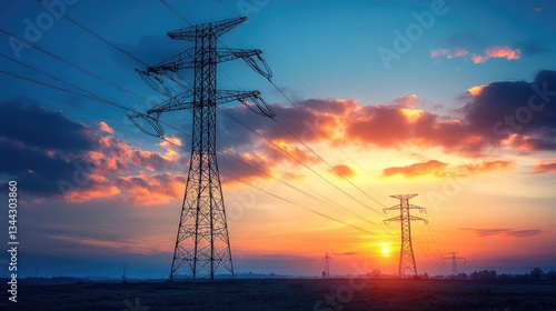 High-voltage power lines at sunset; vibrant sky. Illustrates electricity transmission and distribution at dusk.