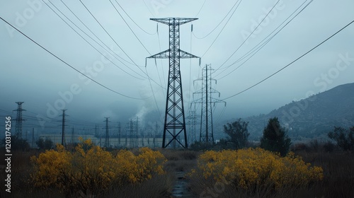 powerline, electricity, fog, industrial, landscape, energy, transmission, wire, infrastructure, nature, smoke, factory, pollution, foggy, yellow, wildflower, contrast, urbanisation, misty, environmental, tower, utility, grid, atmospheric, moody, overcast, sustainability, rural, countryside, electric, cable, industry, modernity, stark, cloud, industrialization, scenic, haze