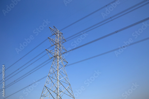 High-voltage transmission tower and electricity voltage wiring cable with sky background.