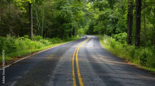 Highway Horizons: Dynamic Picture of Asphalt Highway – Smooth Black Pavement Cutting Through Green Fields and Distant Hills, Yellow Center Lines, Roadside Guardrails, and Trucks Speeding Under a Cloud