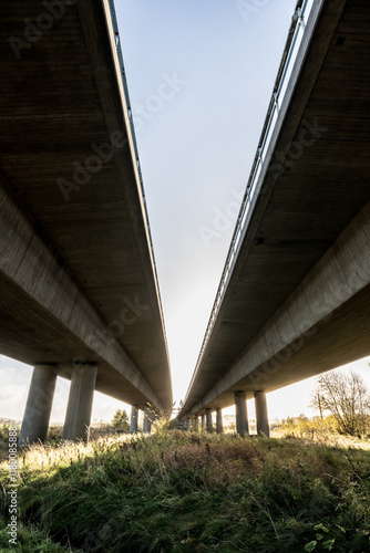 Highway overpass viewed from underneath.