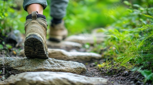 Hiker ascending uphill path, easy uphill hiking technique, nature background, stepping stones for success