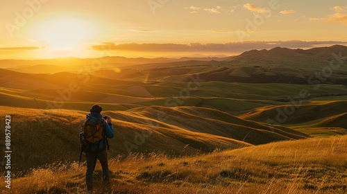 hiker, sunset, golden hour, hill, rolling hills, landscape, nature, travel, adventure, view, panoramic view, mountain, vale, horizon, sky, cloud, grass, field, meadow, sunlight, golden light, warm light, evening, dusk, silhouette, backpack, camera, scenery, scenic, beauty, peaceful, tranquil, relaxing, serenity, inspiration, wilderness, exploration, freedom, escape