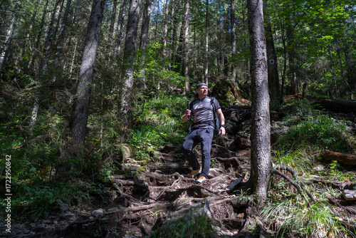 tour tourism, travel, adventure, hiking, hiker, man, male, descent, forest, timberland, tree, trail, path, root, nature, outdoors, wilderness, exploration, activity, sport, lifestyle, romania, carpathians, terrain, challenge, exercise, endurance, fitness, ecology, biodiversity, flora, greenery, scenic, landscape, vacation, trip, photo, filming, action, camera, video, life events