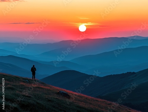 hiker, mountain peak, sunrise, adventure, nature, silhouette, mountain chain, landscape, hiking, outdoors, scenic, exploration, solitude, sunset, dawn, trekking, wilderness, travel, mountain, orange sky, golden hour, peaceful, majestic, mountain view, sky, scenery, climbing, hilltop, wanderlust, serene, early morning, panoramic view, horizon, achievement, photo