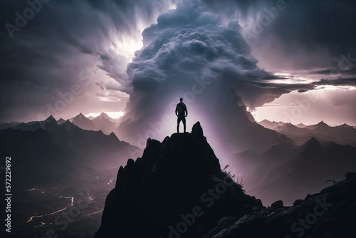 Hiker on top of a mountain with a thunderstorm approaching. Generative ai.