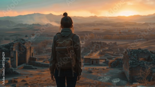 hiker, photographing, sunset, landscape, adventure, travel, nature, outdoors, mountain, scenery, backpack, exploration, sky, cloud, beauty, scenic, horizon, wilderness, trekking, hiking, journey, photo, traveler, remote, serene, peaceful, evening, golden hour, capturing, moment, freedom
