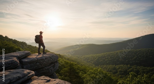 hiker, mountain, vale, mist, fog, sunrise, dawn, morning, landscape, scenic, view, overlook, cliff, rock, outdoors, nature, adventure, exploration, travel, backpacking, summit, peak, ridge, forest, tree, green, serene, peaceful, tranquil, solitude, contemplation, meditation, freedom, achievement, success, journey, discovery, wanderlust, silhouette, person, man, woman, hat, recreation