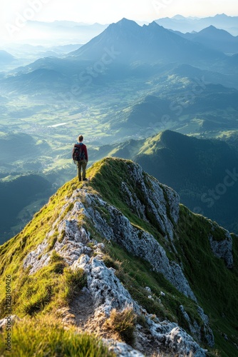 hiker, mountain, peak, view, landscape, vale, hill, nature, adventure, trekking, rocky, exploration, outdoors, traveling, sunlight, summit, wilderness, hiking, gear, calmness, scenery, grass, elevation, altitude, journey, freedom, fresh, air, connection, peacefulness, natural, beauty, panoramic, vista, breathtaking, climbing, serenity, ecological, horizon, life events, fitness, recreation, solitude, trail, morning, majesty, green, environment, sky