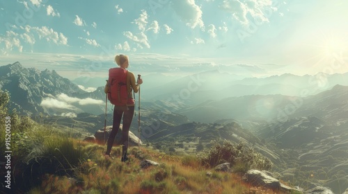 Hiker steep trail trekking poles rocky mountain background