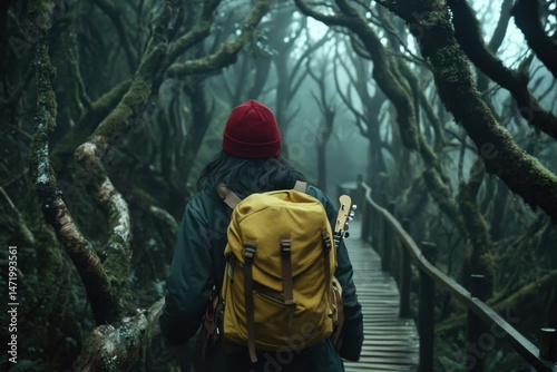 forest, woman, hiking, path, travel, adventure, nature, backpack, wood, tree, fog, mist, fantasy, magic, mysterious, exploring, journey, hiker, walk, trail, trekking, wood, environment, destination, discovery, scenic, landscape, wanderlust, ukulele, girl, paseo