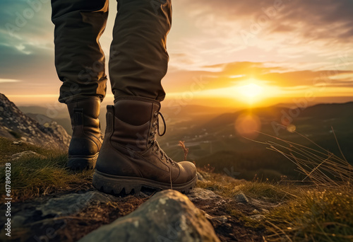 Hiker wearing brown jeans and boots stands on the rocky surface. Traveller watching the sunset at backdrop. Generative AI.