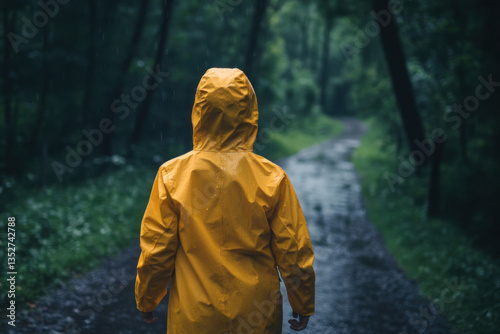 rain, forest, path, raincoat, yellow, walking, hiker, hiking, nature, wood, tree, water, wet, waterproof, exploration, adventure, travel, trekking, park, trail, environment, climate, meteorology, storm, dripped, cold, dark, wood, alone, mysterious, journey