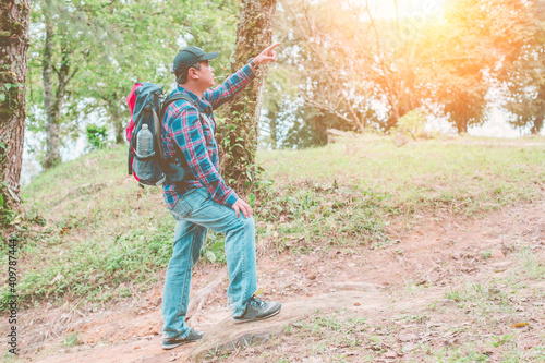 Hiker with backpack relaxing man hiking holiday, wild adventure.