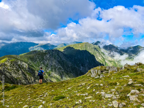 mountain, landscape, nature, mountain, sky, hiking, peak, alps, snow, vale, rock, summer, view, travel, cloud, blue, green, alpine, grass, trekking, high, cloud, meadow, scenery, adventure, europa, romania, people, man, hiker, ridge, cloudy