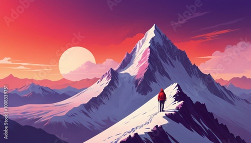 hikers or climber on sunset mountain landscape illustration background