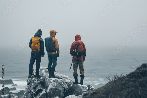 hiker, adventure, fog, sea, ocean, rock, backpack, travel, outdoors, nature, mist, coastline, exploration, journey, trekking, wilderness, landscape, friends, hike, freedom, wanderlust, horizon, backpacking, leisure, activity, vacation, destination, tour tourism, scenic, serene, tranquil, people, hiking, mountain, active, lifestyle, together, sport