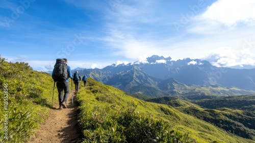 Hikers trek along a scenic mountain trail, surrounded by lush greenery and distant snow-capped peaks under a clear blue sky.