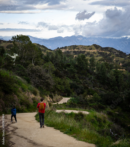 Hiking a trail through the mountains in Los Angeles, California at sunset.