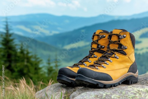 hiking, boot, mountain, landscape, adventure, rocky, terrain, nature, hike, footwear, yellow, colours, green, hill, travel, exploring, trekking, summer, day, rugged, design, scenic, view, alpine, environment, gear