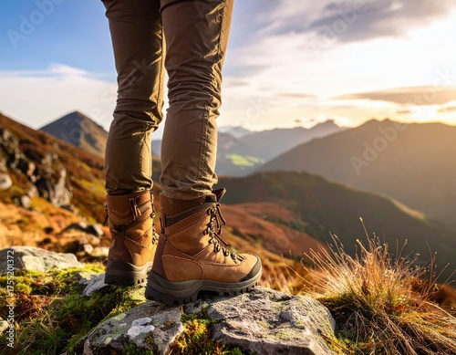 hiking, boot, mountain, outdoors, adventure, travel, landscape, nature, sunset, sky, scenic, footwear, terrain, rock, sunlight, gold, brown, grass, peak, range, exploration, active, elevation, horizon, light, stone, trail, journey, environment, explore, summer, autumn, climbing, activity, view
