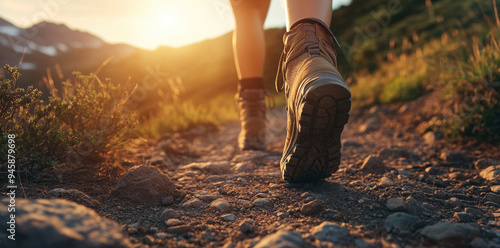 hiking, boot, mountain, trail, sunset, nature, adventure, travel, wilderness, outdoors, landscape, rock, path, walk, explore, journey, freedom, relaxation, footwear, backcountry, trekking, scenic, golden hour, mountain hiking, exploration, summer, mountain scenery, scenic view, discover, escapade, wanderlust, mountain climbing, mountaineering, rock climbing
