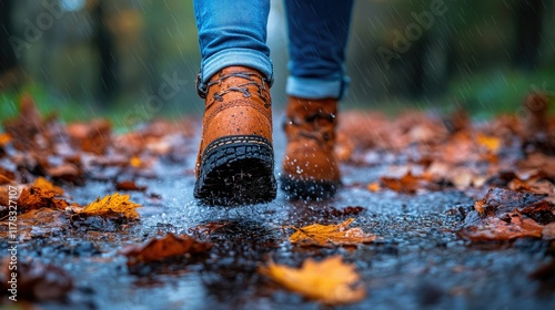 hiking, boot, autumn, leaf, rain, forest, walking, wet, wood, outdoors, fall, nature, tree, water, path, trail, season, travel, adventure, landscape, scenic, foliage, orange, yellow, brown, mud, puddle, shoe, foot, leg, waterproof, protection, weather, exploration, journey, hiker, trekking, recreation, solitude, peace, calmness, freedom, discovery, wanderlust, step, ground, colours, beauty, moody