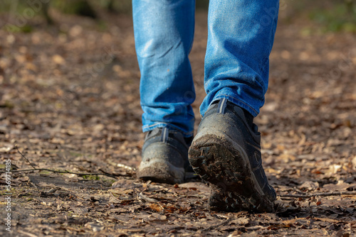 Hiking concept, Selective focus of a man legs with blue jean and shoes in the move, Low angle of people walk in the forest with nature path, Hobby, Leisure activities, Sport and recreation background.