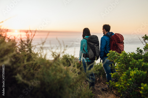 Hiking couple enjoying a sunset view