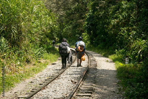Hiking from Santa Teresa Hidroeléctrica to Aguas Calientes to reach Machupichu. Path following the train tracks with several hikers.