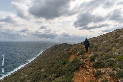 Hiking path to the lighthouse at rocky cape Tainaron on a cloudy spring day, Mani, Peloponnese, Greece.