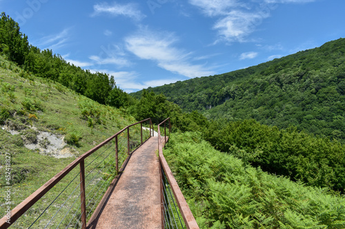 Hiking trail leading to Okatse Canyon in village Gordi, Imereti region, Georgia. Path surrounded by hills covered by green trees. Blue sky with light clouds above. Georgian tourist attraction