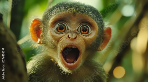 Hilarious close-up of a surprised monkey with wide eyes and mouth open, caught in a moment of shock, as if reacting to something unexpected in the jungle.